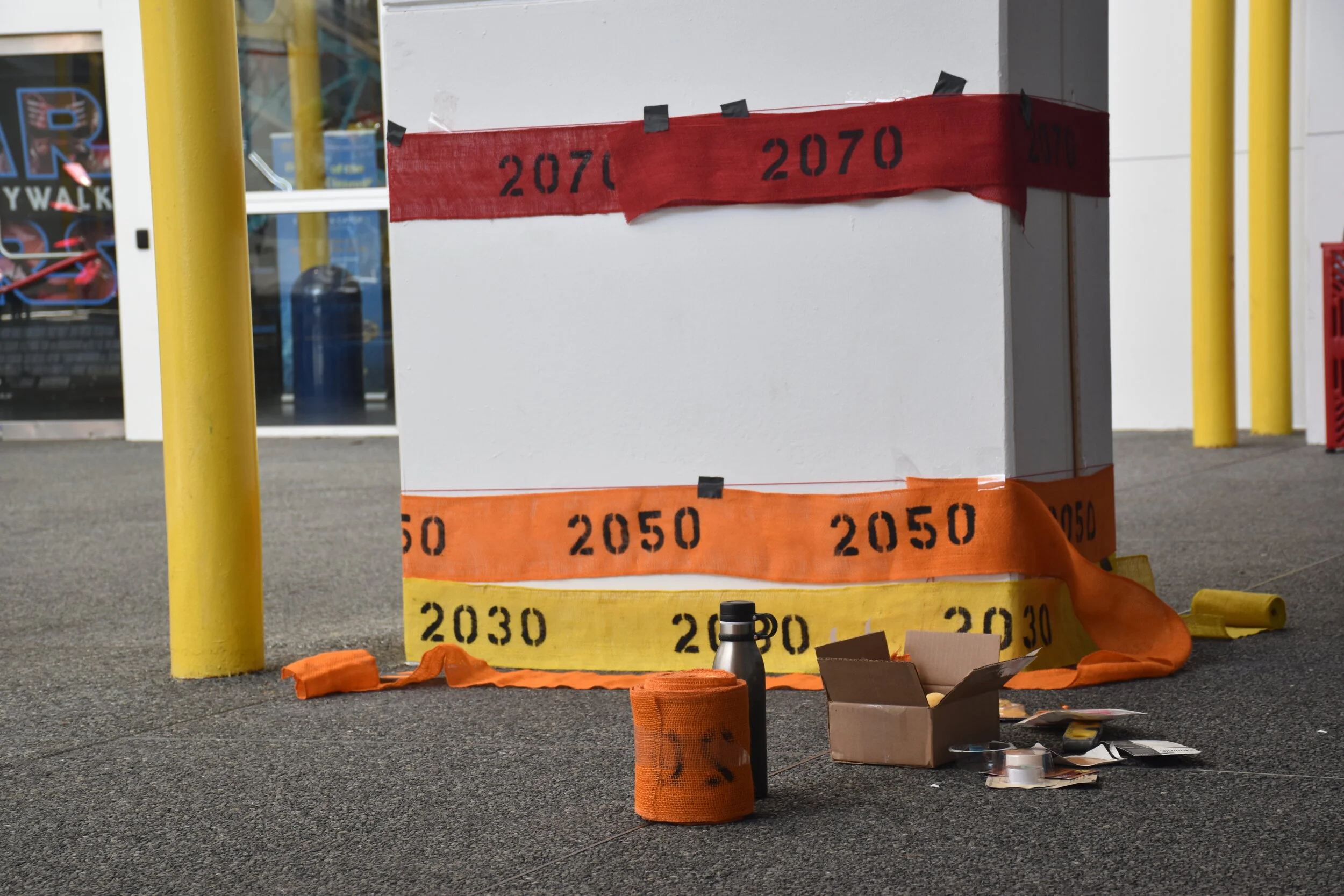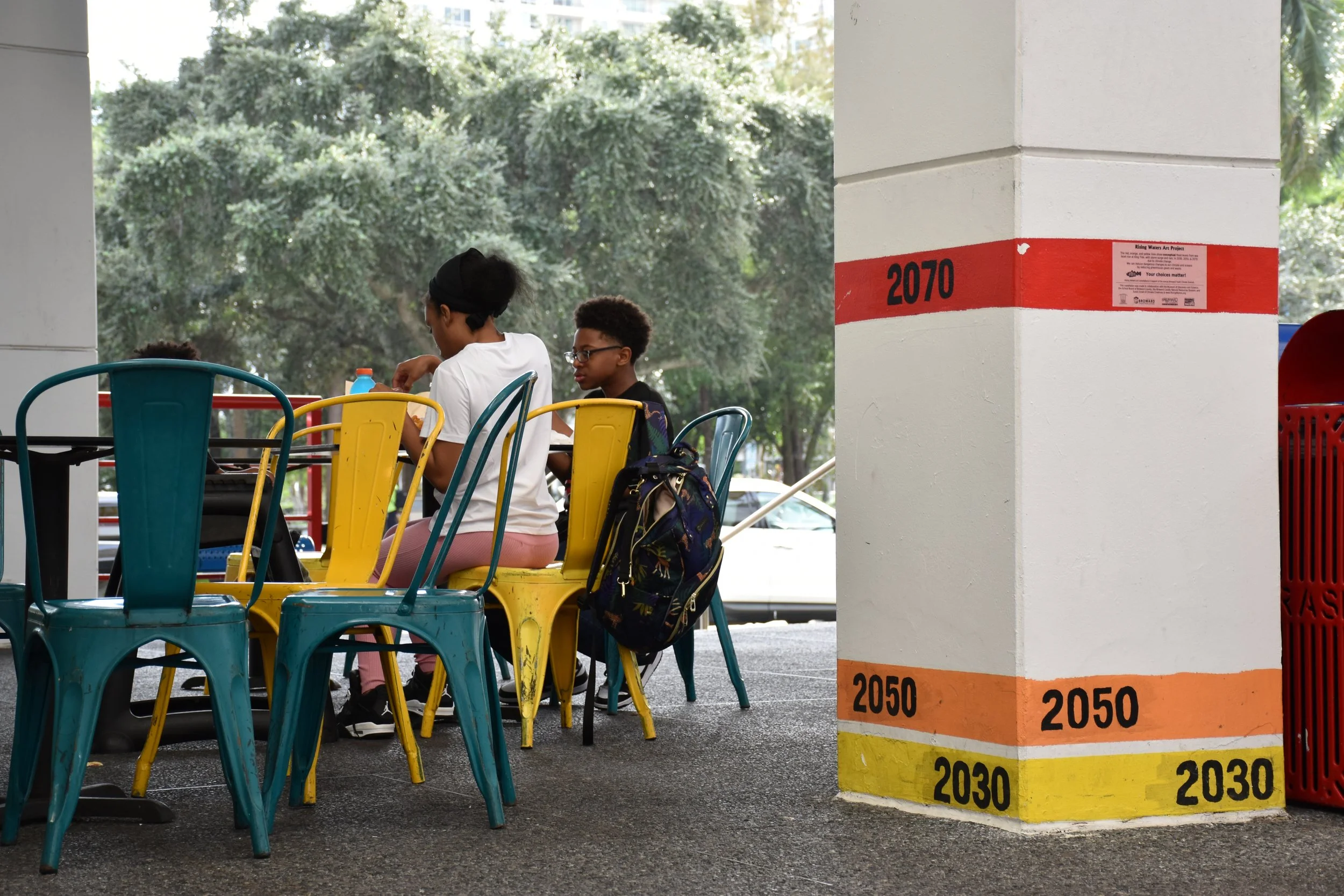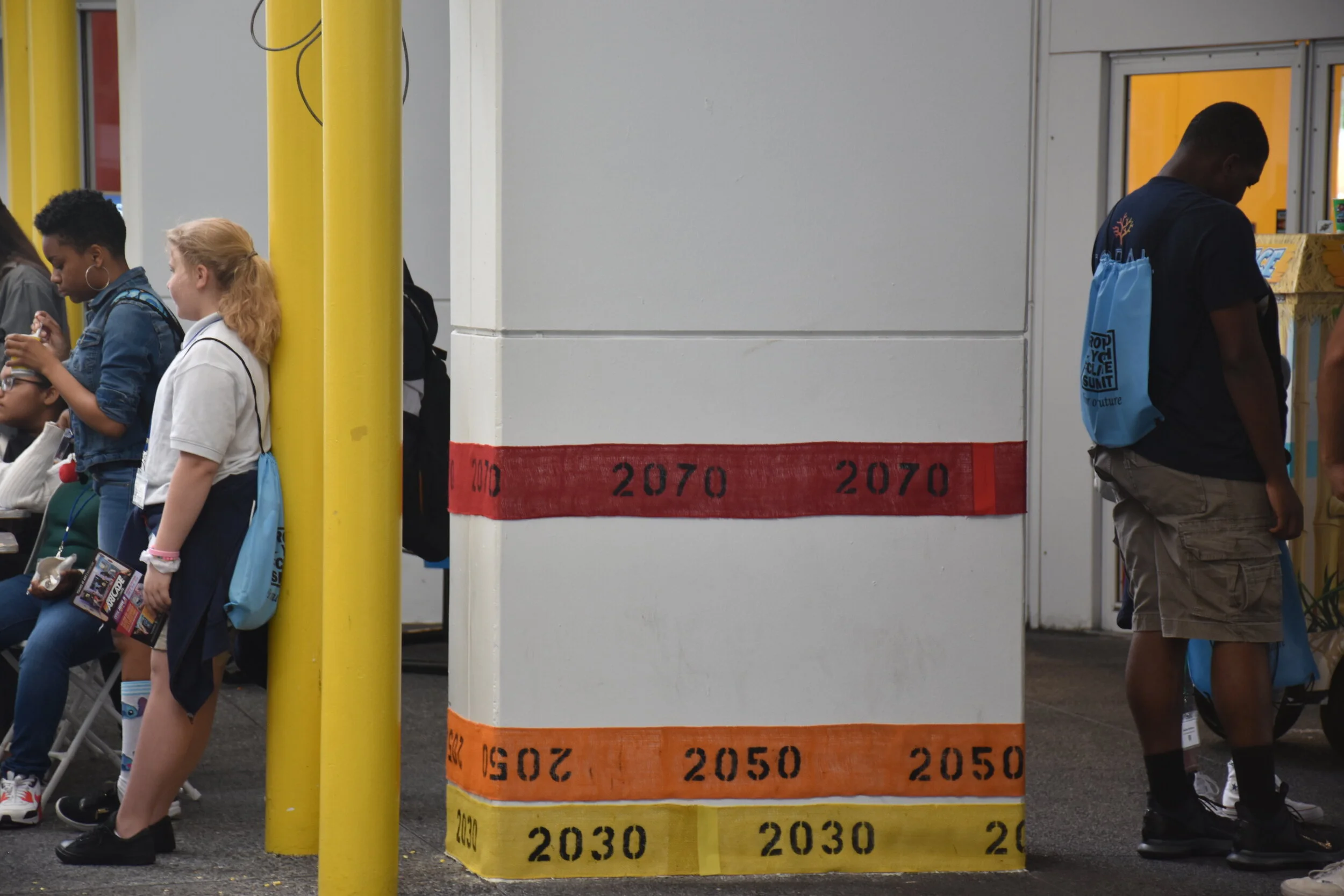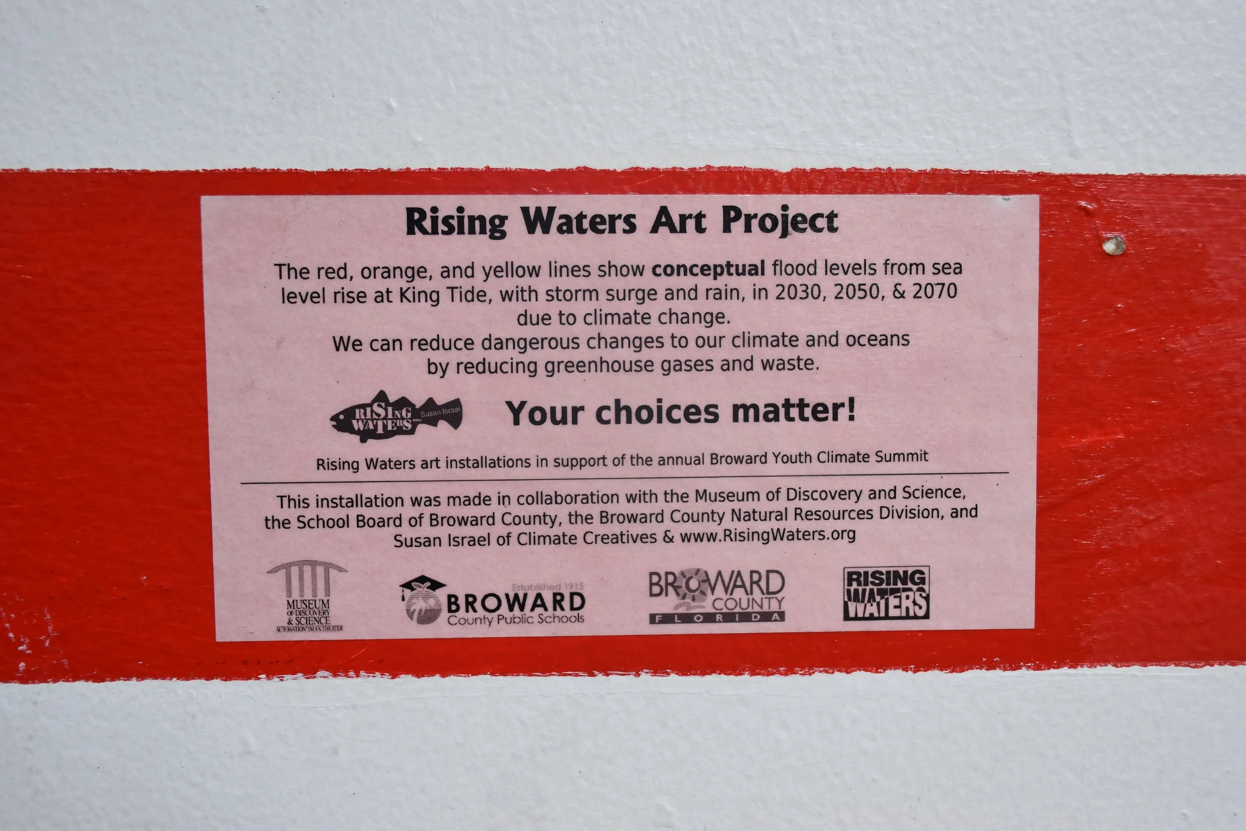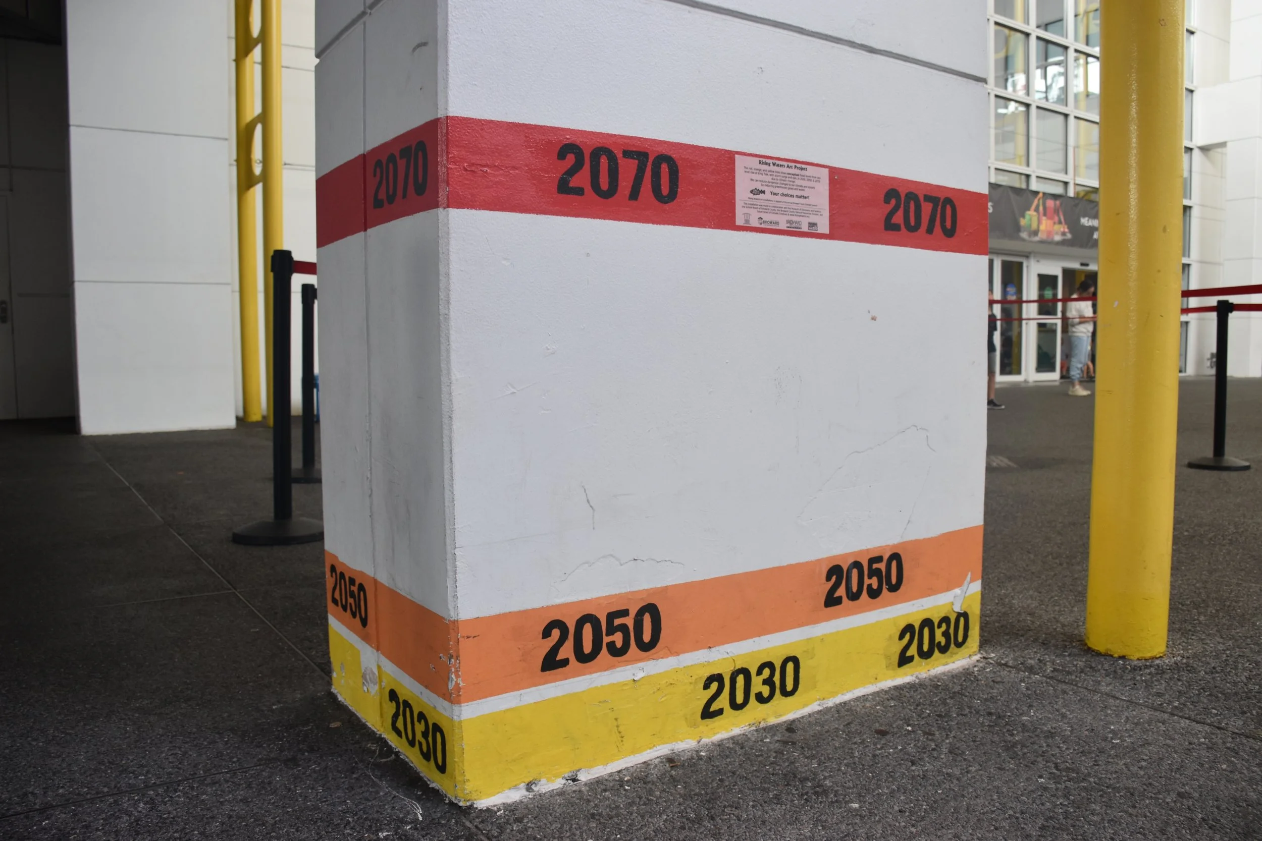 Broward County was our first train-the-trainer community for Rising Waters. The School Board of Broward County and the Broward County Environmental Planning & Community Resilience Division held a climate change youth summit in January 2020 with over 800 Broward County public school students at the Museum of Discovery and Science (MODS) in Ft. Lauderdale, Florida. The theme of the summit was Sea Level Rise, and Rising Waters was installed at MODS in keeping with that theme. Students from 28 schools learned how to install the science-based artwork at their schools and communities. In November 2021, students installed Rising Waters at multiple school buildings around Broward County. You can see them here. In 2022, the lines were painted permanently onto the columns of the Museum forecourt.