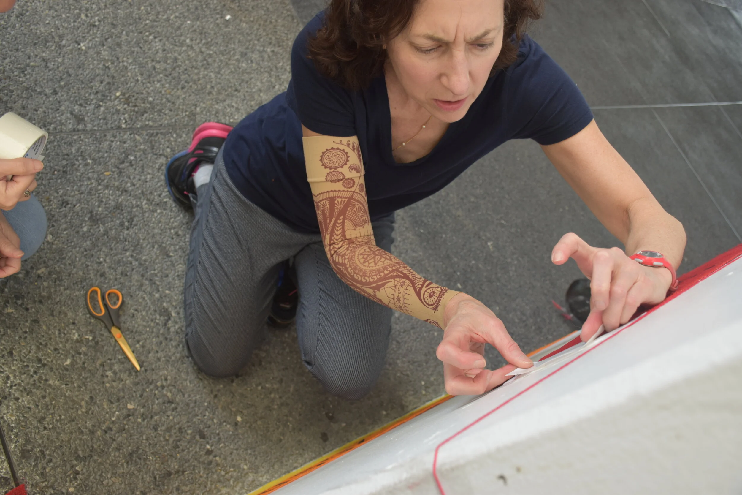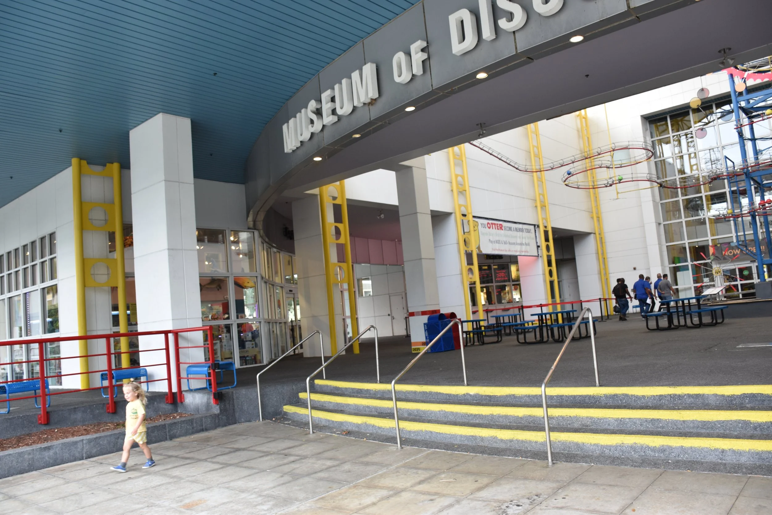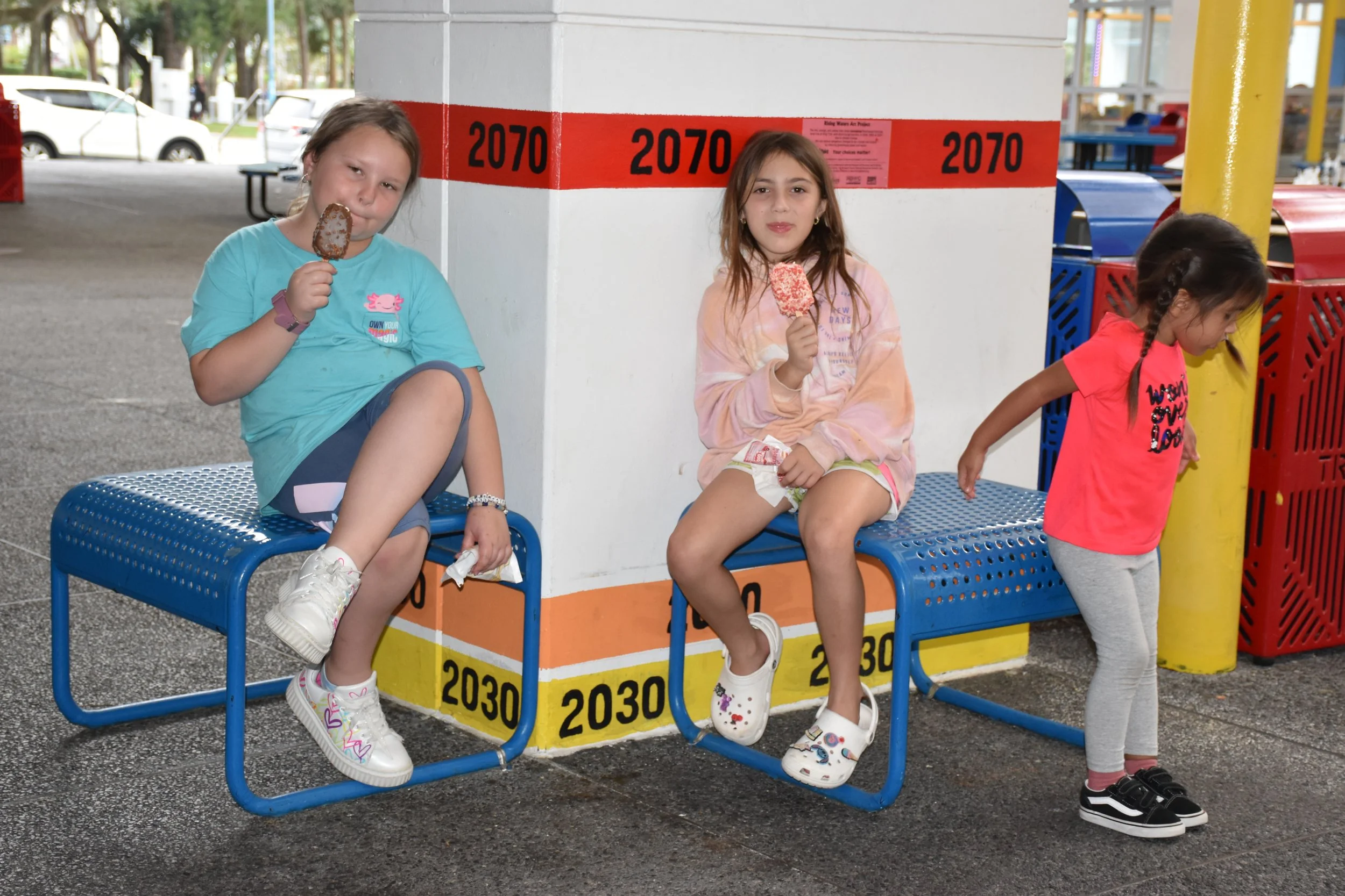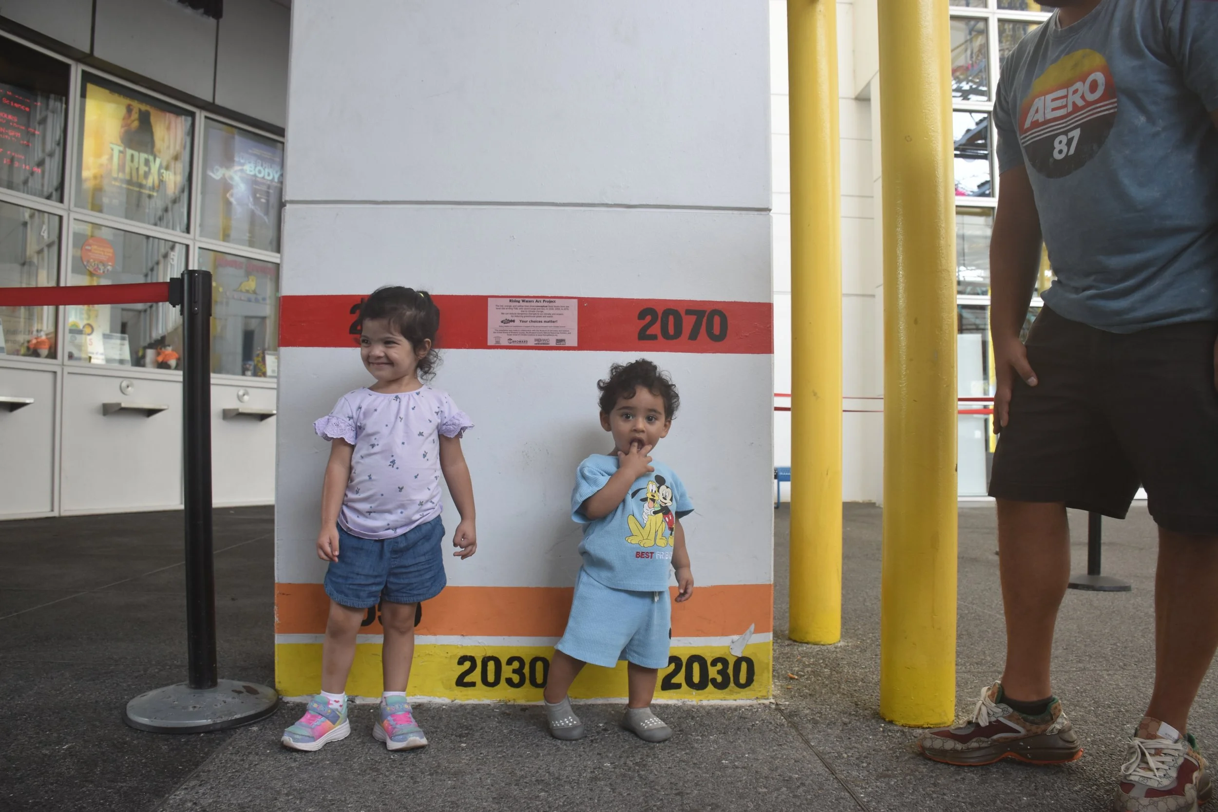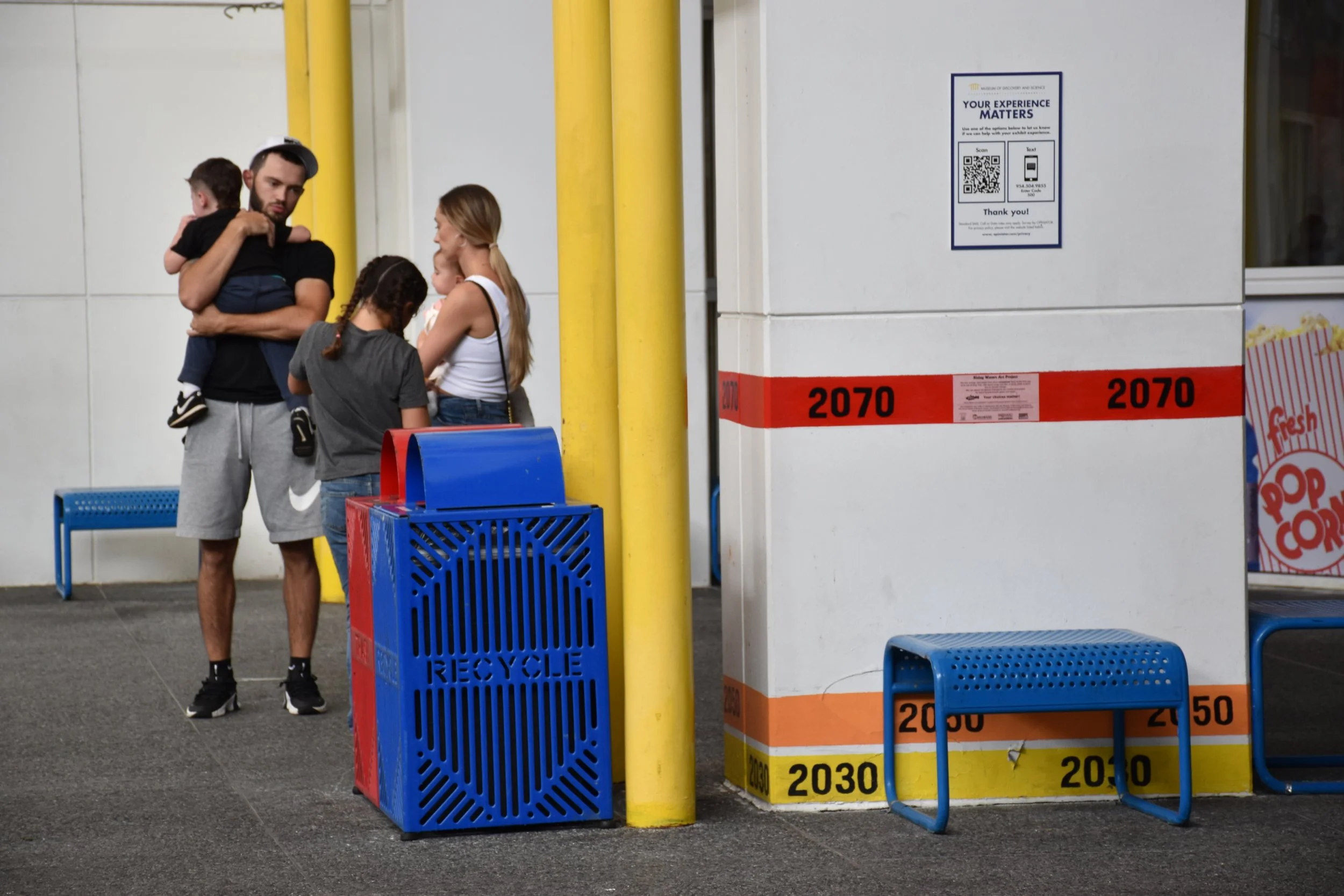 Broward County was our first train-the-trainer community for Rising Waters. The School Board of Broward County and the Broward County Environmental Planning & Community Resilience Division held a climate change youth summit in January 2020 with over 800 Broward County public school students at the Museum of Discovery and Science (MODS) in Ft. Lauderdale, Florida. The theme of the summit was Sea Level Rise, and Rising Waters was installed at MODS in keeping with that theme. Students from 28 schools learned how to install the science-based artwork at their schools and communities. In November 2021, students installed Rising Waters at multiple school buildings around Broward County. You can see them here. In 2022, the lines were painted permanently onto the columns of the Museum forecourt.
