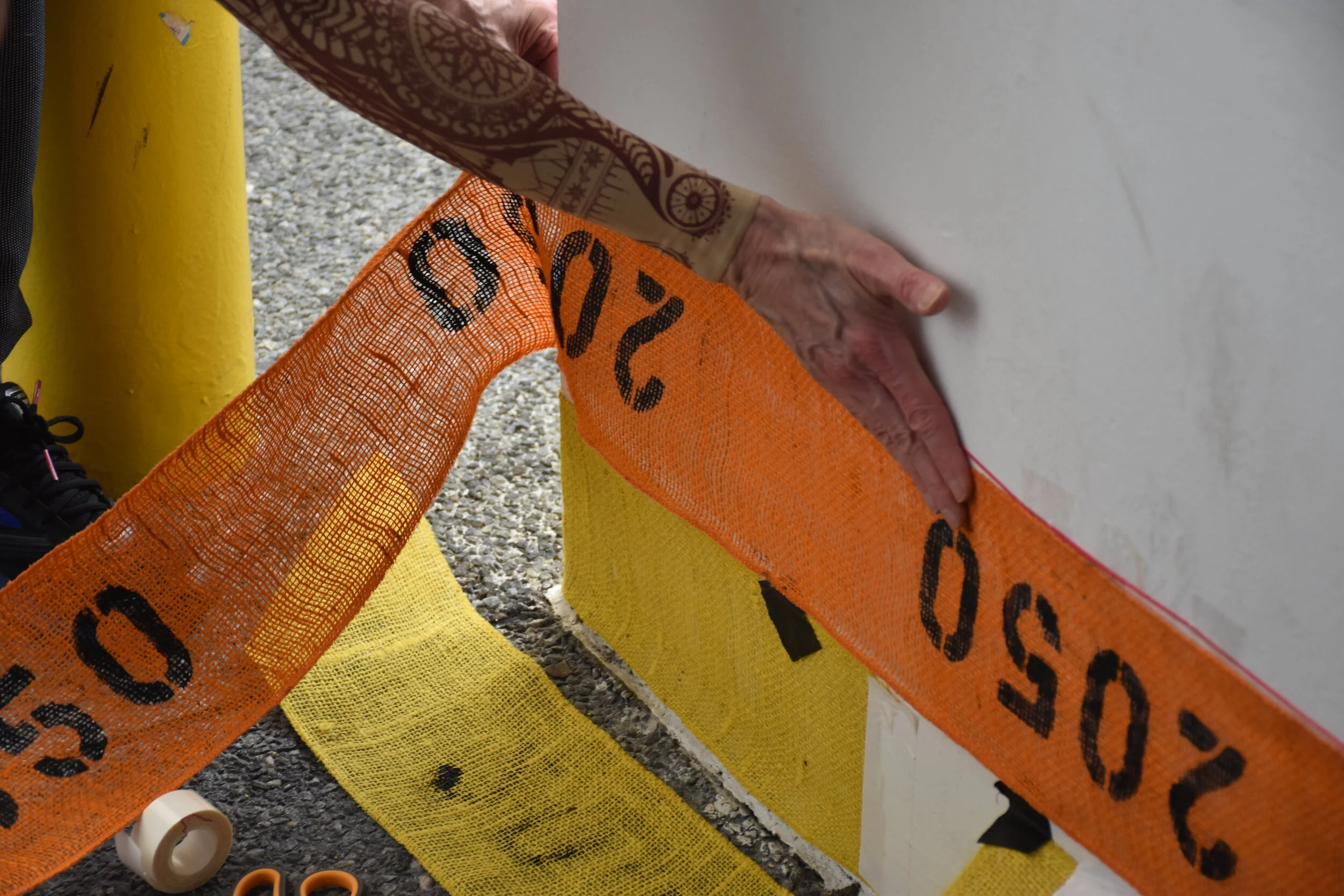 At the original installation, two iterations of Rising Waters were used: lines and fish flags. Lines wrapped major columns in the entry court with dates stenciled on them – 2030, 2050, and 2070 – to show potential future flood levels in a major storm event with sea level rise, storm surge, and rainfall at king tide. Lines in the project colors, which indicate rising threat levels, were installed at the actual heights where water might flood according to projections and data from NOAA and the SE Florida Climate Compact Group. The lines will remain installed at least until the spring.